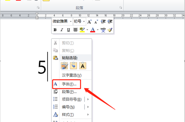 1、以Word2010版本为例,如下图,需打出5的平方,输入数字5后,点击鼠标右键,在弹出框里选择“字体”;
