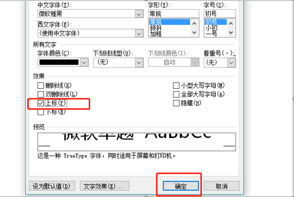 2、在弹出的字体设置框里,效果下面的“上标”打上勾,然后点击下面的确定;