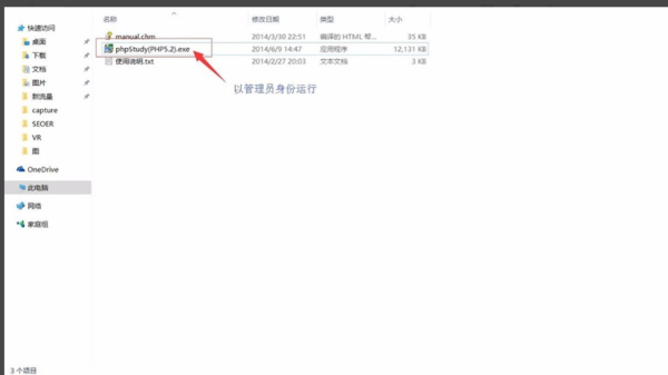 ③安装PHPstudy 这里面会有三个文件。第一个是说明文件 第三个是说明文件 第二个是运行文件。点击以管理员身份运行。