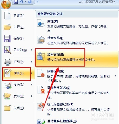 2、点击office按钮后,会出来一些选项,其中有个“准备”。鼠标移动到准备选项后,右边会再出来一些选项,其中就有个“加密文档”: