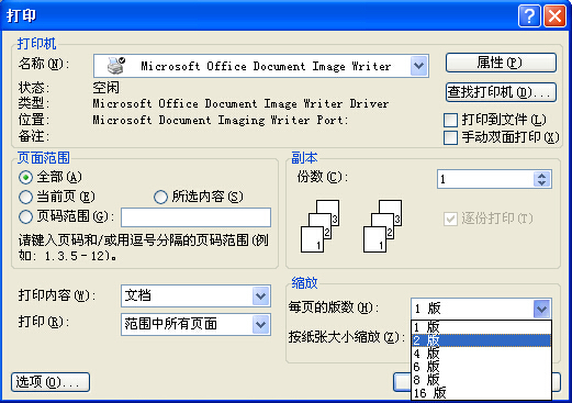 2、弹出打印对话框,在缩放处每页的版数选2版即可,如图所示。