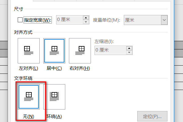 3、在弹出的“表格属性”对话框中,将“文字环绕”选为“无”,点击“确定”。