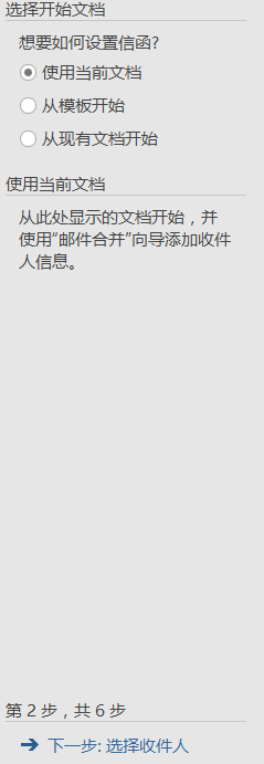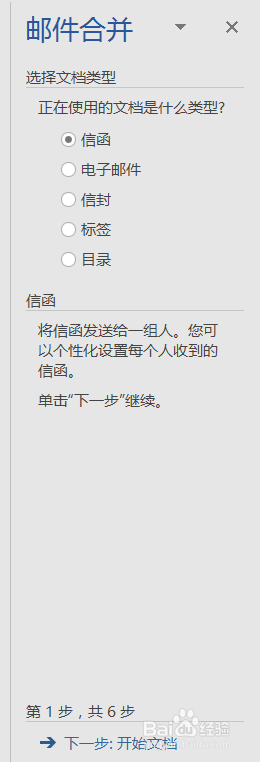 第一步选择文档类型,一般选信函;第二步选择开始文档,点击使用当前文档。
