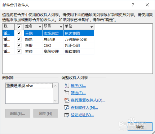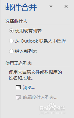第三步邮件合并,选择“使用现有列表”,点击浏览,把excel表格选中,弹出邮件合并收件人对话框,全选,点击确定。