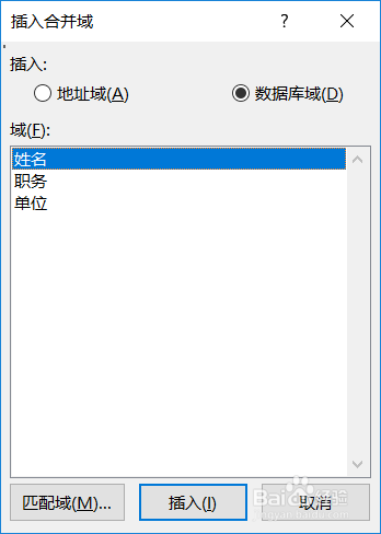 3、光标插入在“购书人姓名:”右边,点邮件合并工具栏上的‘插入合并域“按钮-插入合并域对话框中的域里选’购书人姓名‘-点插入-关闭,即在此位置插入《购书人姓名》;