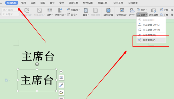 4、选中新的文本框,依次打开“页面布局→旋转→垂直旋转”;