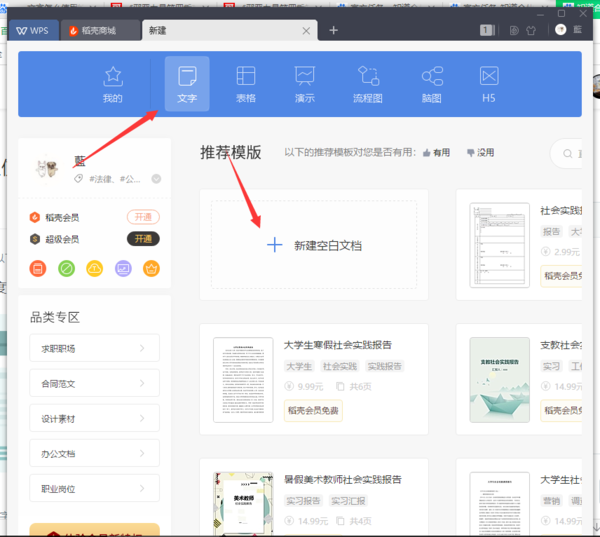 1、首先在电脑上打开WPS软件,然后在WPS中选择“新建”-“文字”,点击“新建空白文档”。