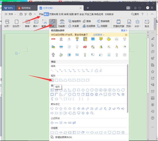 2、在 WPS 文本编辑区域中, 打开 "插入" 菜单选项卡, 然后单击 "形状选项" 按钮。