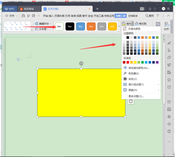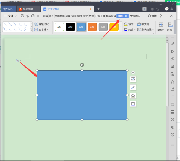4、在图形选择后, 在 Wps 文档编辑区域中绘制, 此时在菜单栏中可以看到 "绘图工具" 菜单选项。