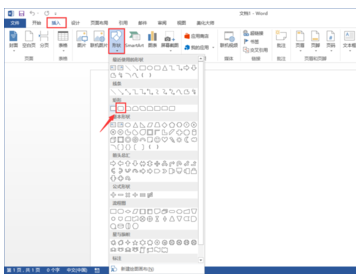 1、首先在电脑上打开word 2013办公软件,点击上方菜单栏里的【插入】功能菜单,在下方功能里找到形状,点击弹出下拉菜单,可以选择形状列表里的圆角矩形作为组织结构图的框图,如下图所示。