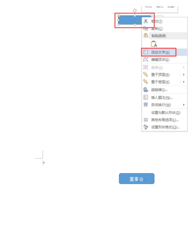 2、点击形状里的圆角矩形,在word输入区域内居中位置绘制一个圆角矩形,然后选定该图形,点击鼠标右键弹出下拉菜单,选择下拉菜单里的【添加文字】,在插入的形状图形里输入文字,如下图所示。