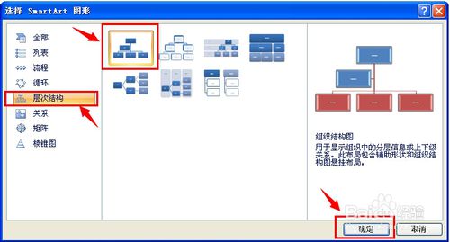 在弹出来的对话框中,点击“层次结构”,选择第一个形式,即是“组织结构图”。