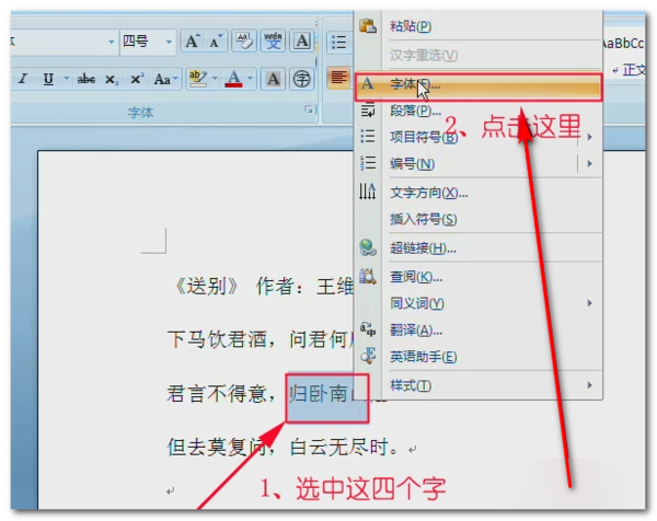 2、例如,要让“归卧南山”的位置上升。先选中这几个字,点击鼠标右键,在下拉菜单中选择“字体”。
