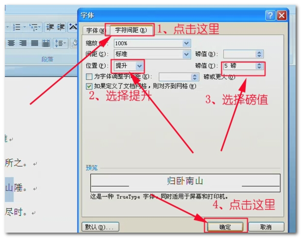 3、在弹出的对话框中点击“字符间距”,有提升和下降的选项,这里选择“提升”,选择合适的磅值,点击确定。