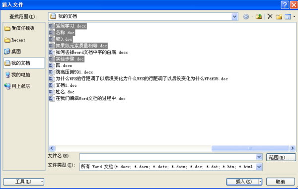 3、弹出插入文件对话框,按住Ctrl键,选中需要合并的多个文档即可,如图所示。