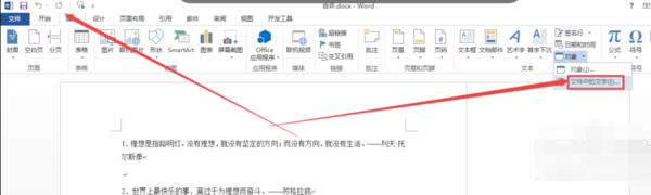 3、点击一下对象按钮,会出来两个选项,我们选择“文件中的文字”;