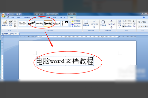 这时候我们看到文档中已经插入进来了我们刚才输入的艺术字,我们双击这个字,就可以调出进一步的设置选框;