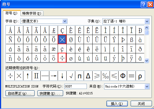 2、在弹出的符号对话框中,选择×号,单击插入按钮;选择÷号,单击插入按钮,最后单击关闭按钮即可。