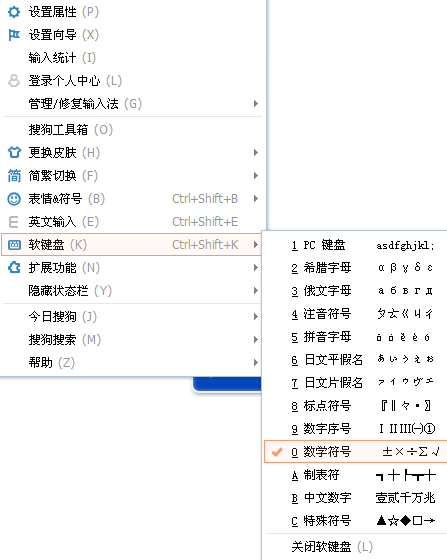 1、在输入法栏的空白处,单击右键,在弹出菜单中选择软键盘---->数字符号,如图所示;