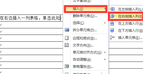 4、如果在表格中插入列,就将鼠标移动到想要插入列的表格位置,单击右键点击【在表格右方插入列】就行。