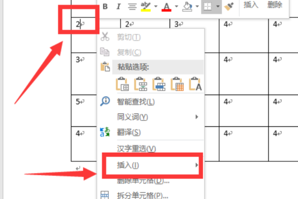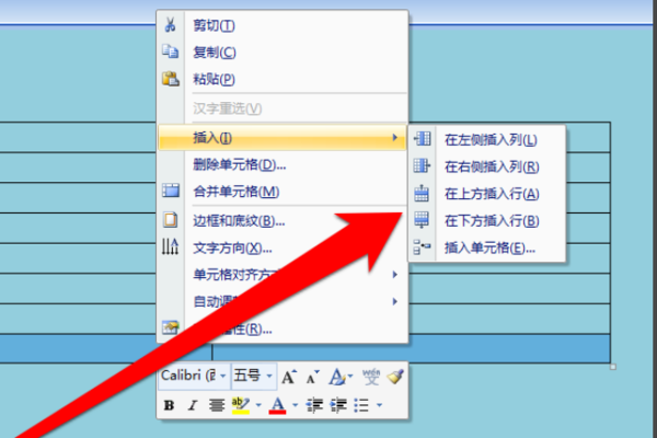 1、要在表格下方增加行数,就将鼠标移动到表格最后一行,单击鼠标右键,会出现【插入】选项,将鼠标移至“插入”。