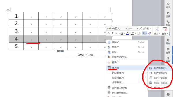 对于行来说,你要在某一行的下面添加一行,那么就在该行表格最右端的换行符就是那个拐着的箭头处按回车见就好了