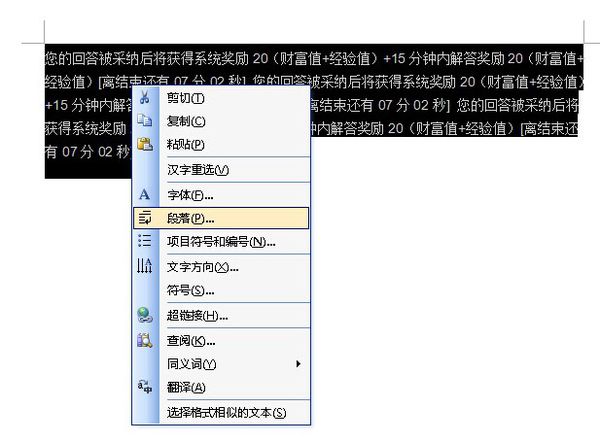 1、先选中你要改变的文本内容,右击,然后选择“段落”;