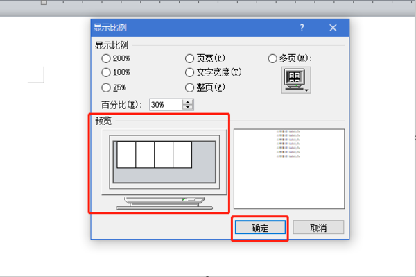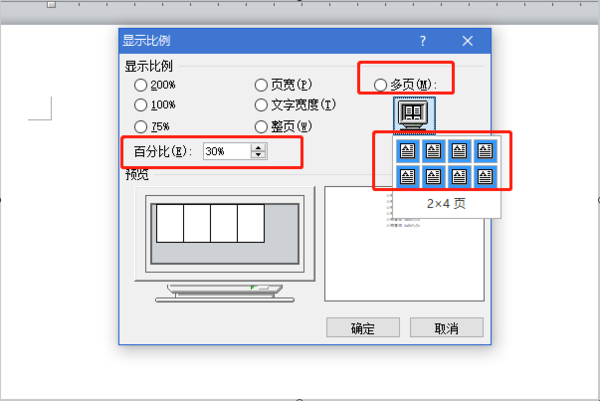 3、在弹出的显示比例设置框里,选择右边的多页,也可在多页下面的页数里选择一个页面显示几页,左边的百分比是指显示页数的大小,可调节;
