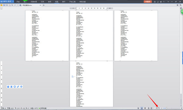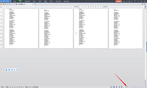 注意“-”号的左侧是比例值,你调整到100%,基本上就是单页,缩小比例可以得到双页、三页、四页面... 比例42%就可以四页显示