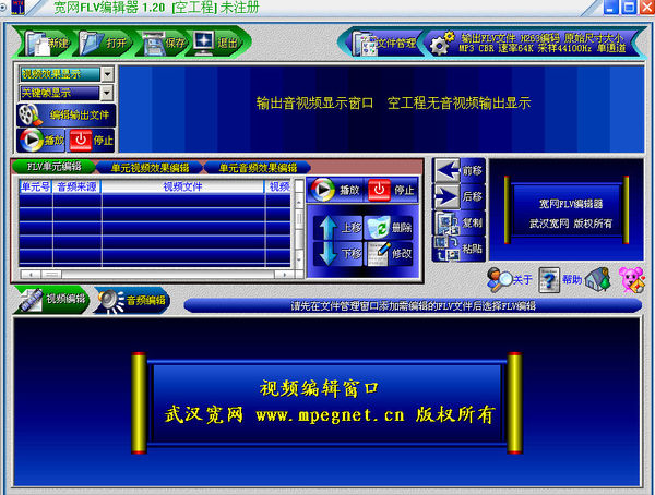 用宽网FLV编辑器 该软件实现对FLV文件实现可视化的任意裁减、合并同时提供图片叠加、文字叠加及运动效果、以及十多种视频处理效果,以及实现实现FLV同步声音及MP3伴音任意组合,提供十多种音频效果调整、音频滤波、音频人声过滤等处理,并实时编码生成MP4、FLV、AVI、动画GIF、FLASH、3GP等文件文件,是制作多媒体教学软件的好帮手。