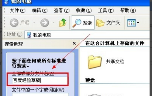 2.点击搜索后,我们就看见界面的左边有一个,全部或部分文件名这里有个空白的框,那么我们在框中输入自己要找的文件名的名字,例如这里输入百度经验草稿。接下来点击搜索按钮即可。