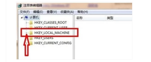 3.进入注册表,找到“HKEY_LOCAL_MACHINE”,请依据下图指示,点击红色框内,箭头所示的文件夹前的三角按钮。