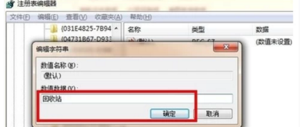 9.点击修改后,出现如下界面,请在数值名称一项中,将“{默认}”修改为“{回收站}”点击确定。