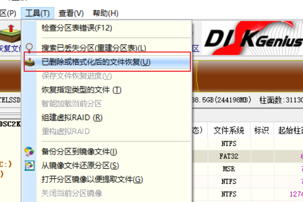 3、点击软件上方工具选项下的【已删除或格式化后的文件恢复】。