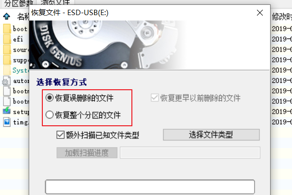 4、在当前界面根据需要选择恢复的方式,可以恢复误删除的文件,也可以恢复整个分区的文件。