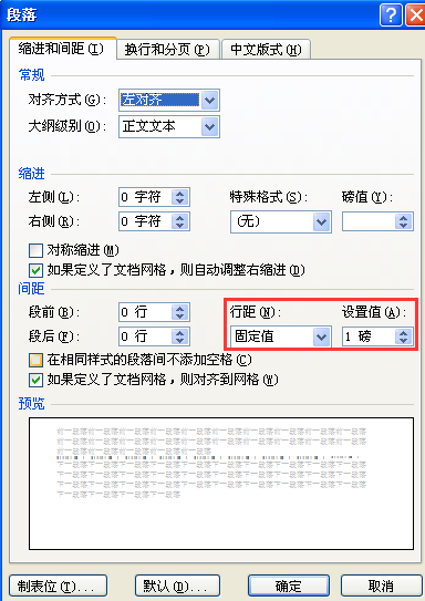 第2步,在Word菜单栏依次单击“格式”→“段落”菜单命令,打开“段落”对话框。在“行距”下拉菜单中选中“固定值”,并将“设置值”调整为“1”。设置完毕单击“确定”按钮。