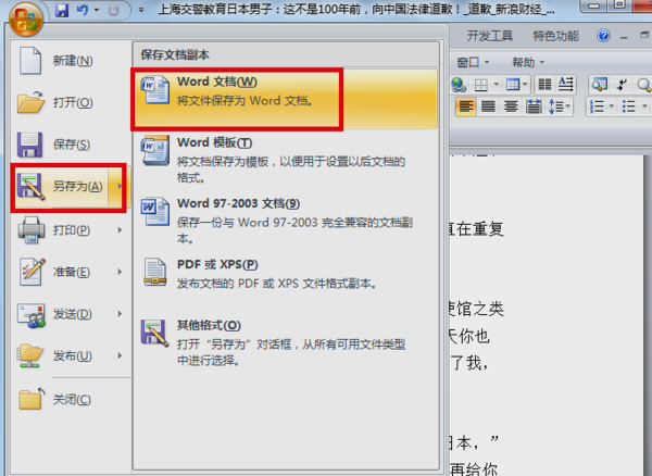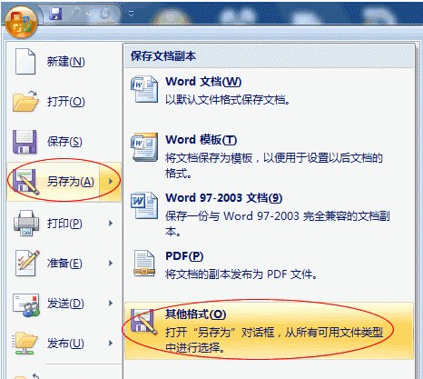 步骤一、打开Word文档,单击左上角的“Office按钮”,然后选择“另存为”按钮,在弹出的“保存文档副本”中选择“其他格式”;