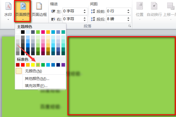 3、选中全部页面,鼠标停留在上方“页面颜色”,点击茶绿色,word中设置页面颜色为茶色背景完成。