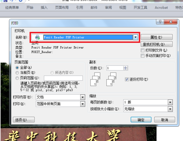 4、然后在出现的打印界面中,设置好“打印机”已经其它需要的选项。