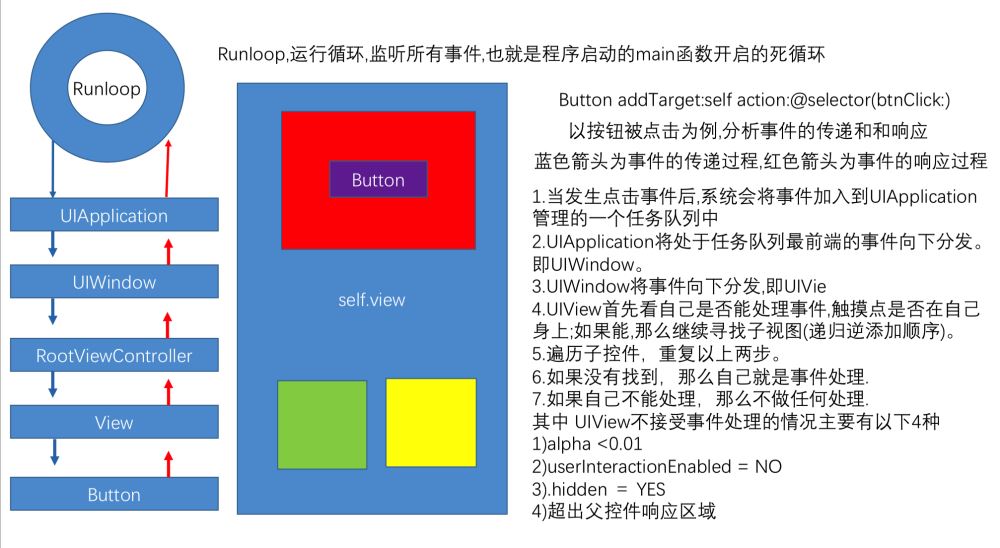 - 我们点击屏幕产生触摸事件,系统将这个事件加入到一个由UIApplication管理的事件队列中,UIApplication会从消息队列里取事件分发下去,首先传给UIWindow