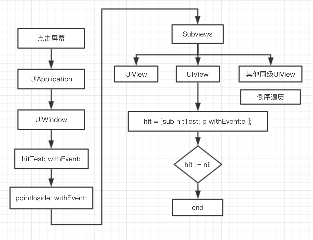 - 在hitTest:withEvent:方法中就会去调用pointInside: withEvent:去判断当前点击的point是否在UIWindow范围内,如果是的话,就会去遍历它的子视图来查找最终响应的子视图
