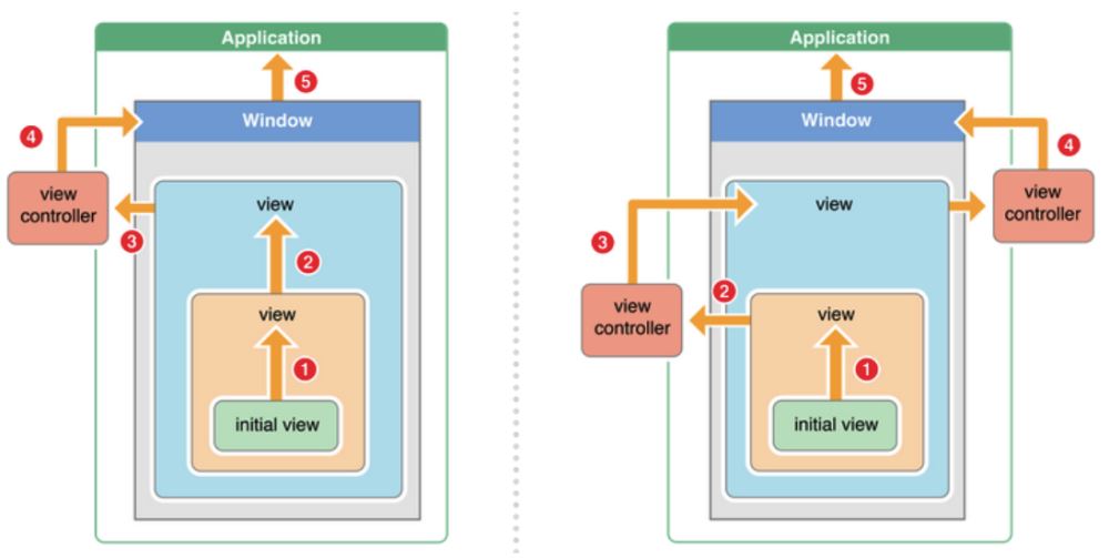 - 如果view的控制器存在,就传递给控制器处理;如果控制器不存在,则传递给它的父视图