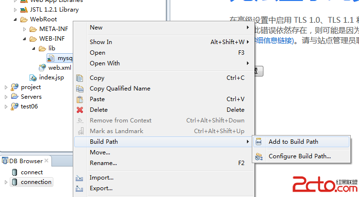 10,通过右击mysql-connectior-java-5.1.6.jar,在build path中单击add to build path