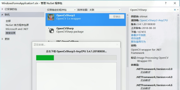 打开【工具】->【库程序包管理器】->【管理解决方案的NuGet程序包】,在其中搜索OpenCVSharp,选择合适的点击【安装】(最好安装最新的)。一直等待完成。
