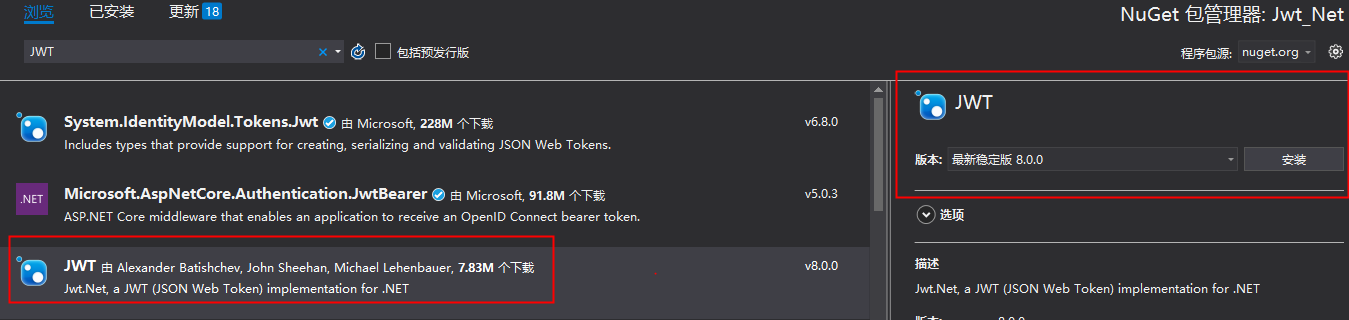 然后使用nuget搜索jwt,安装jwt类库,如下图。