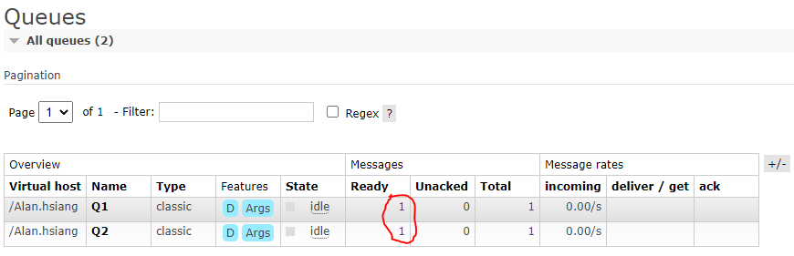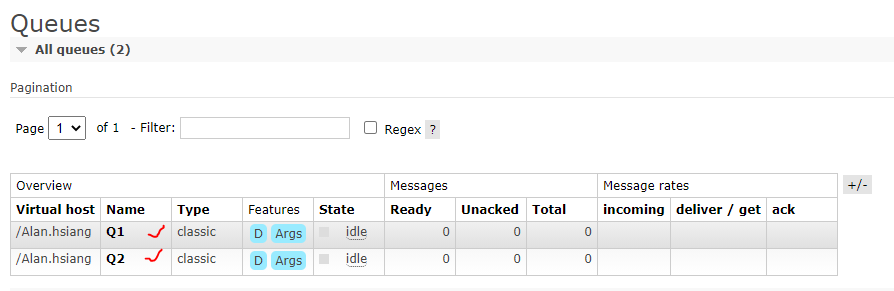 在同一个virtual host下新增两个队列q1,q2,如下图所示: