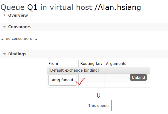 将两个队列绑定到系统默认的fanout交换机,如下所示: