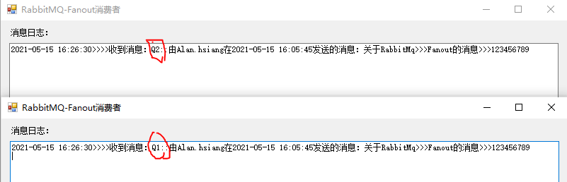 当启动消费者后,两个消费者,均会订阅到相关消息,如下图所示: