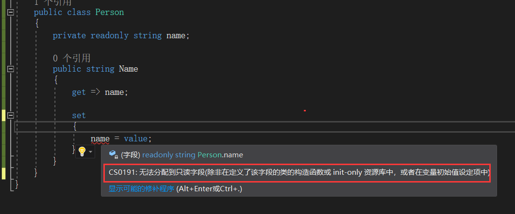 上面这张图就已经很清晰的解释了,原来 init 就是自动生成了一个对 私有只读字段 的封装,对于 readonly 相信大家已经轻车熟路了,它的初始化只有两种方式:声明时和构造函数中,但从 c# 9 开始就多了一个属性赋值方式,也就是说现在有三种赋值方式了,还原代码如下: