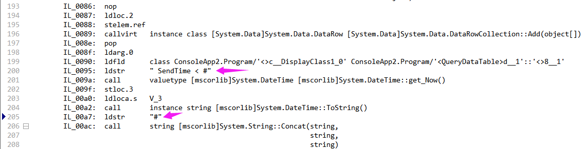 异步方法会生成状态机,用 c# 模式看反编译的代码,那些自动生成的状态机类看都看不到,谈何修改??? 比如你能找到: var where = $" sendtime < #{datetime.now.tostring()}#"; 吗?